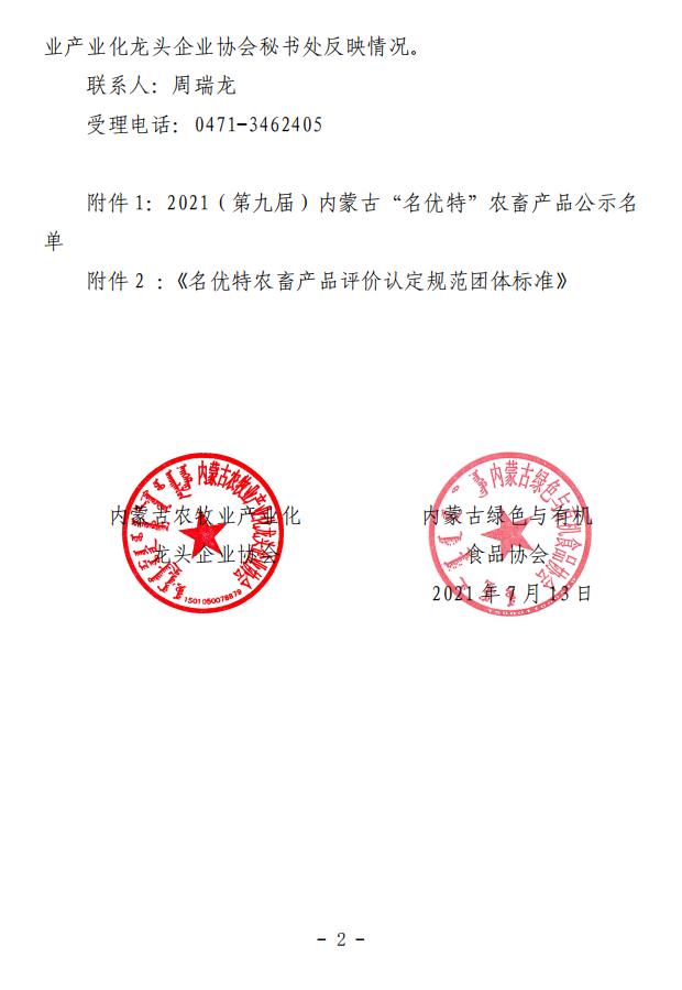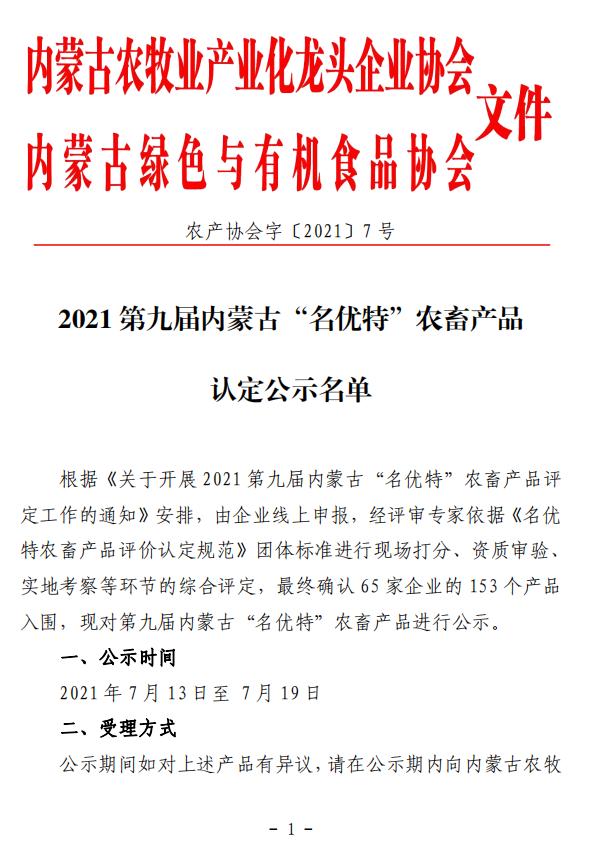 2021(第九屆)內蒙古“名優(yōu)特”農畜產品認定公示名單