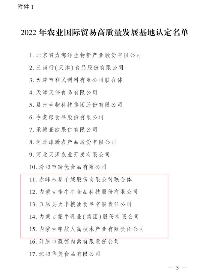 8月29日,農(nóng)業(yè)農(nóng)村部辦公廳印發(fā)《關(guān)于認(rèn)定2022年農(nóng)業(yè)國際貿(mào)易高質(zhì)量發(fā)展基地的通知》,認(rèn)定116個(gè)基地為2022年農(nóng)業(yè)國際貿(mào)易高質(zhì)量發(fā)展基地,其中,內(nèi)蒙古5家企業(yè)上榜。