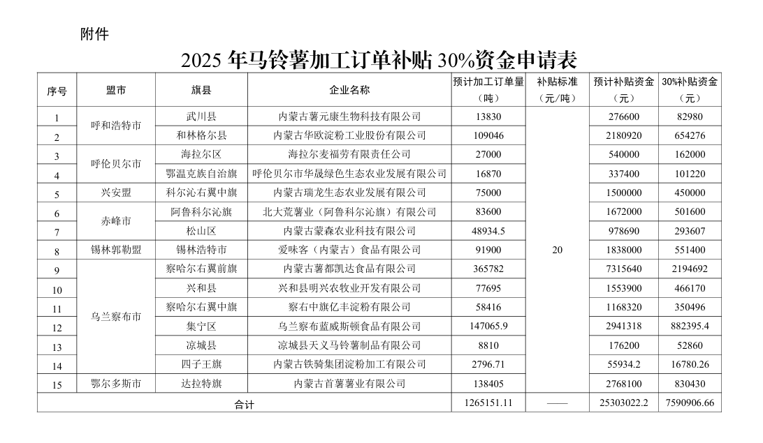 按照《內(nèi)蒙古自治區(qū)農(nóng)牧廳關(guān)于印發(fā)2025年馬鈴薯加工訂單補(bǔ)貼項(xiàng)目實(shí)施方案的通知》(內(nèi)農(nóng)牧加工發(fā)〔2025〕305號)要求,經(jīng)盟市組織申報(bào)、實(shí)地核查、公示,自治區(qū)復(fù)核,現(xiàn)將2025年相關(guān)盟市上報(bào)的馬鈴薯加工訂單補(bǔ)貼30%資金申請情況予以公示,公示期為15天。如對公示有異議,請及時向自治區(qū)農(nóng)牧廳反映。