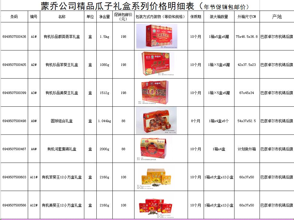 呼市鄂爾多斯大街石羊橋十字路西移動(dòng)大廳西20米北巷,現(xiàn)有大量年節(jié)禮品盒:巴盟有機(jī)葵花子禮盒低價(jià)促銷(xiāo)包郵,聯(lián)系電話(huà):15334782928,十盒包郵,價(jià)格如下: