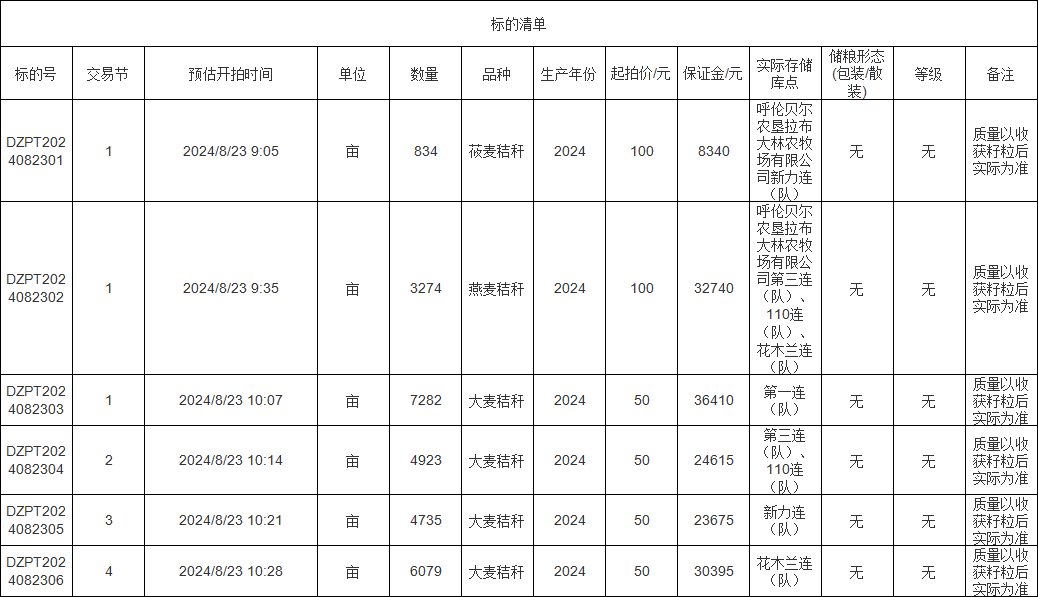 轉(zhuǎn)讓標的為莜麥秸稈、燕麥秸稈、大麥秸稈,涉及面積莜麥秸稈834畝、燕麥秸稈3274畝、大麥秸稈(1-4標)分別為7282畝、4923畝、4735畝、6079畝,意向受讓方在競買前應(yīng)自行對標的預(yù)估數(shù)量和質(zhì)量情況進行充分了解,交易標的均以實際狀況為準。標的存放地位于呼倫貝爾農(nóng)墾拉布大林農(nóng)牧場有限公司,詳情見標的清單: