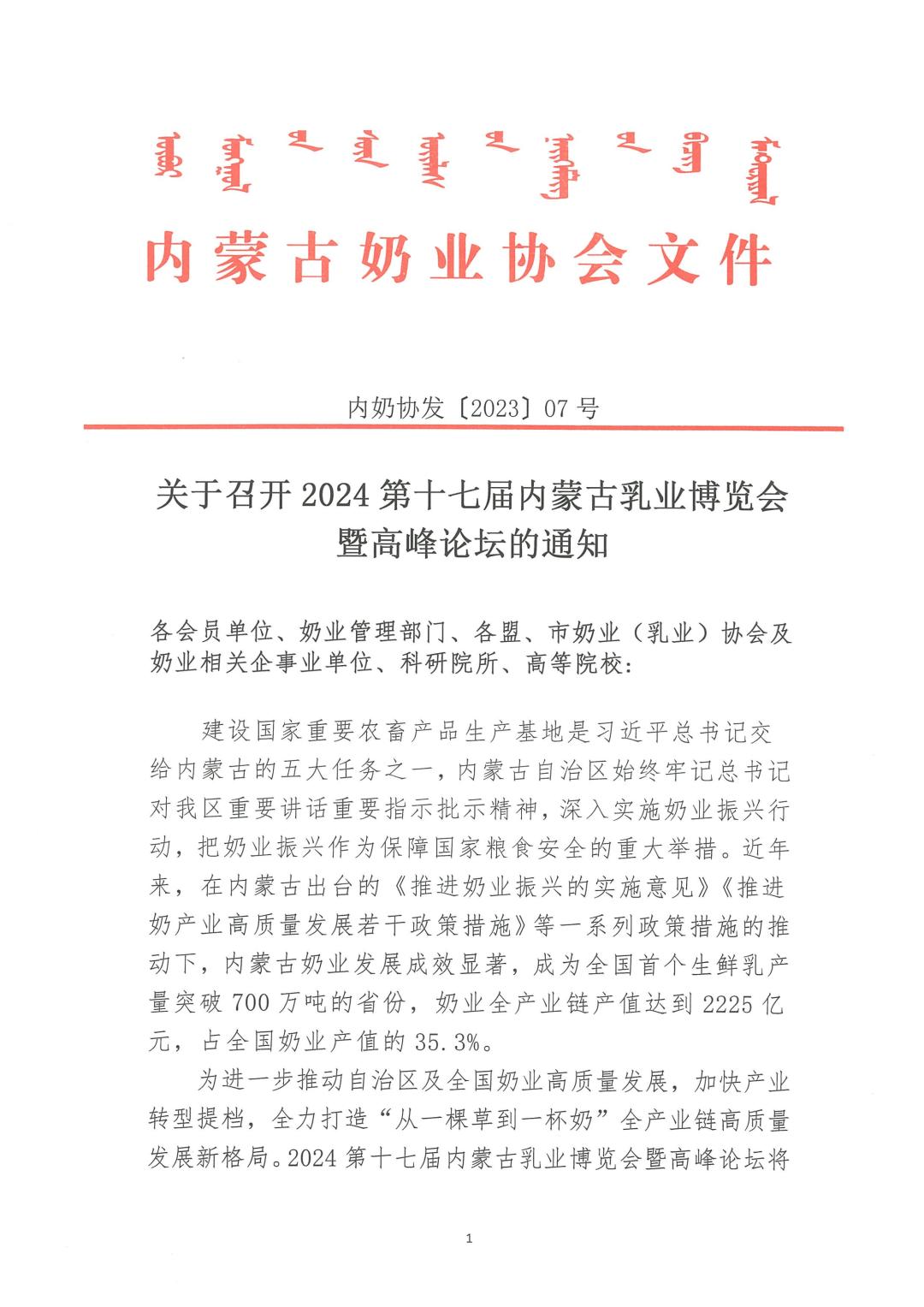 轉(zhuǎn)發(fā):關(guān)于召開(kāi)2024第十七屆內(nèi)蒙古乳業(yè)博覽會(huì)暨高峰論壇的通知