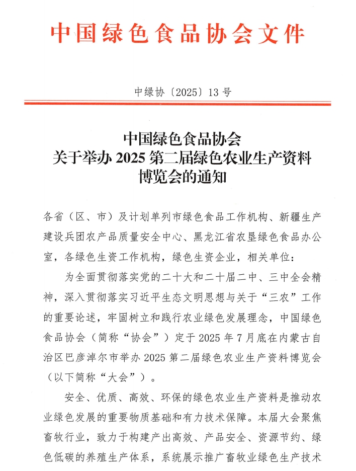 中國綠色食品協(xié)會(huì)關(guān)于舉辦2025第二屆綠色農(nóng)業(yè)生產(chǎn)資料博覽會(huì)的通知