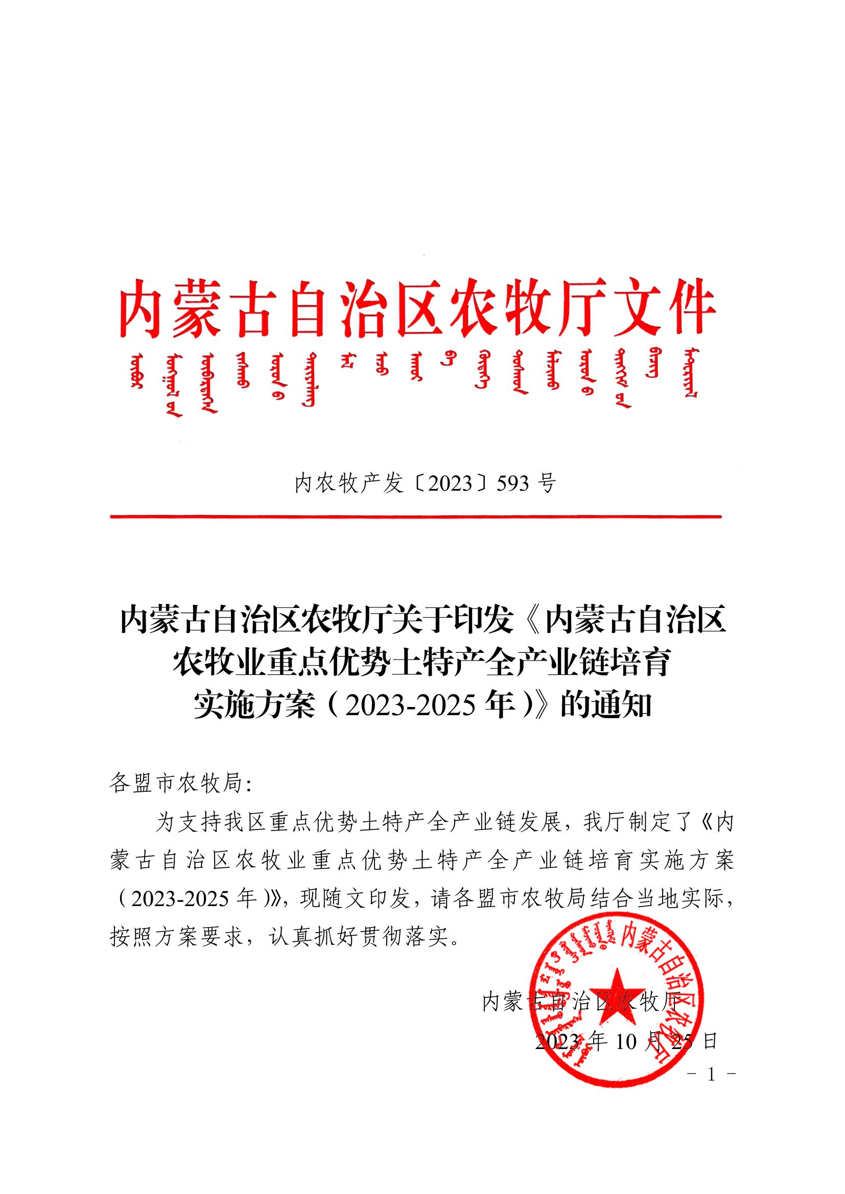 標題:內蒙古自治區(qū)農(nóng)牧廳關于印發(fā)《內蒙古自治區(qū) 農(nóng)牧業(yè)重點優(yōu)勢土特產(chǎn)全產(chǎn)業(yè)鏈培育 實施方案(2023-2025年)》的通知
